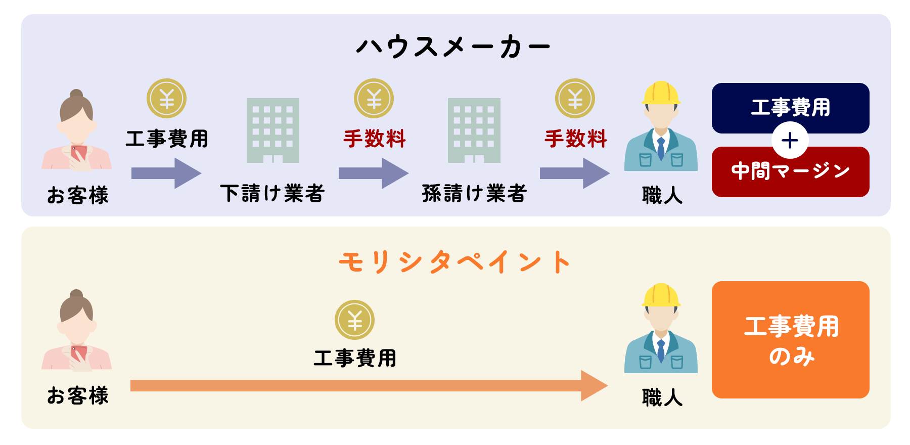 モリシタペイントでは、中間業者を介さない“自社施工体制”を採用しています。